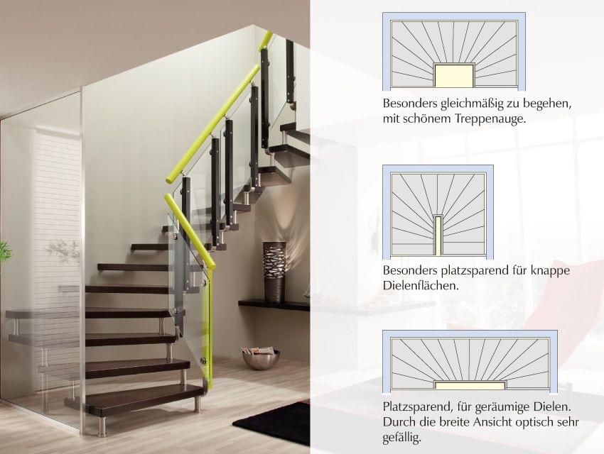 Mit dieser Treppenbauart lässt sich Platz sparen. Daher verlaufen auch fast ein Drittel aller Treppen in Ein- und Zweifamilienhäusern halbgewendelt bzw. zweiviertelgewendelt. Die Unterschiede liegen in der Gestaltung der Grundrissform und der sich daraus ergebenden Stufenverziehung.