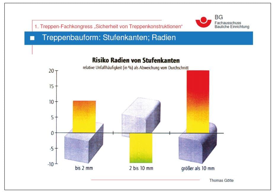 Die meisten Treppenunfälle am unteren Treppenende (Antritt), da dieses oft nicht rechtzeitig erkannt wird. Auch der Treppenanfang (Austritt) birgt Gefahren. Ein weiteres Risiko sind Stufenkanten-Zusätze, deren Radius über 10 mm liegt. Hier besteht Rutschgefahr. Gefährlich können auch Stufenkanten sein, die eigentlich als Sicherheitsprofile eine Treppe besser begehbar machen sollten. Gute Profile schließen Stufen flächenbündig und dauerhaft ab, oder verbessern rutschige Stufenflächen. Wenn sie aber unsachgemäß eingebaut sind und zu weit vorstehen, oder nicht gewartet werden, kann der Schuh bzw. Fuß daran hängen bleiben, der Gehrhythmus wird gestört und man kann stolpern.
