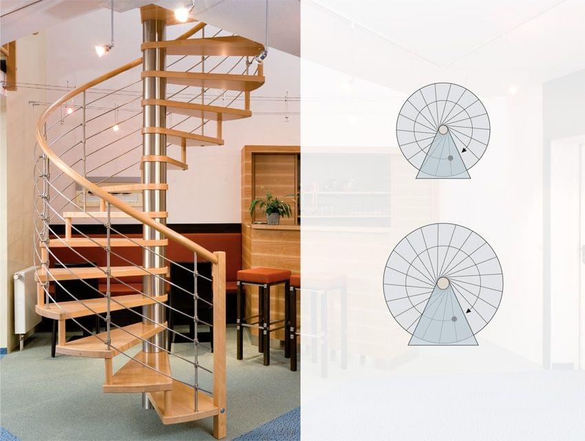 Ein Vorzug von Spindeltreppen liegt nicht nur in ihrer gestalterischen Vielfalt, sondern auch in der konstruktiven Vielseitigkeit. Die Austritt-Ebenen (Podeste) können für jede bauliche Situation konstruiert werden, ebenso die Drehung und Steigung.
